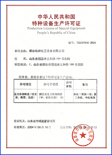 松嶺化工專注化工設(shè)備行業(yè)15年,集科研、開發(fā)、設(shè)計(jì)、 生產(chǎn)于一體的高新技術(shù)企業(yè),還具備設(shè)計(jì)、制造D1、D2類壓力容器資質(zhì)。